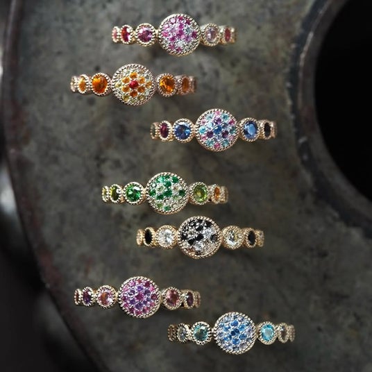 繊細なミル留めでカラーストーンを囲んだ、クラシカルな気品漂う「Mille Chainon(ミルシェノン)」。ストレート(2mm~3.5mm)やV字シルエットなど、豊富なデザインが揃い、一本でも、重ねづけでも楽しめます。ポンポネやサンクルール、ルーチェとの重ねづけにも好相性。組み合わせ次第で、あなただけの手元コーディネートが完成します。