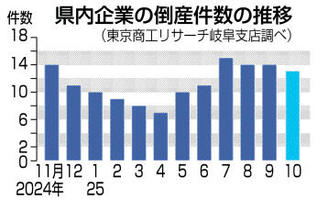 県内倒産10月13件 負債総額2億1000万円増 経済 2025年12月3日 05:00 東京商工リサーチ岐阜支店がまとめ... 残り293文字(全文:310文字) この記事をお読みいただくには「デジタルプラン」または「宅配+デジタルプラン」の会員登録が必要です。無料会員の方はログインしてマイページからコース変更してください。デジタルプランまたは宅配+デジタルプランをご登録中の方はログインしてください。 岐阜新聞デジタル会員に登録すると 無料会員向け記事が読める ニュースレターで最新情報が受け取れる デジタルプラン、宅配+デジタルプランなら Webオリジナルコンテンツが読める 紙面ビューアが読める チケットの先行発売に参加できる お得なクーポンが使える 新規登録ページ ログインページ トップ 岐阜のニュース 経済 県内倒産10月13件 負債総額2億1000万円増 関連記事 貝印、包丁「関孫六」など新製品80点提案 都内で商談会 ワールドEYE タイ、今年の十大ニュース(岐阜信用金庫バンコク駐在員事務所長 高橋英孝) 近況 大興計測技術の坪井晃会長 地域企業が抱える課題の解決へ連携 岐阜大と県中小企業診断士協会 サンタのタクシーやって来る クリスマス仕様に日本タクシーがラッピング 岐阜市内など運行 総合アパレル・ワキタ、海外販売視野 世界最大級のメンズファッション市に初出展へ おすすめ記事 岐阜・瑞穂市発祥、「甘柿の王様」富有柿 実りの秋、樽見鉄道の列車とともに【みのひだ乗り物探訪 第105回】 「子宝温泉 円空の湯」6日オープン 郡上市美並、長良川鉄道の駅ホームと直結 ヒノキ香る空間に改装 愛岐道路の土砂崩れ、復旧長引く恐れ 県多治見土木事務所が原因調査 「豊臣兄弟!」の新年を控えすす払い 大垣市の墨俣一夜城