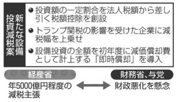 政府、設備投資減税検討 米関税影響で上乗せも 2025年12月3日 05:00 政府が企業の設備投資に対し新たな... 残り558文字(全文:575文字) この記事をお読みいただくには「デジタルプラン」または「宅配+デジタルプラン」の会員登録が必要です。無料会員の方はログインしてマイページからコース変更してください。デジタルプランまたは宅配+デジタルプランをご登録中の方はログインしてください。 岐阜新聞デジタル会員に登録すると 無料会員向け記事が読める ニュースレターで最新情報が受け取れる デジタルプラン、宅配+デジタルプランなら Webオリジナルコンテンツが読める 紙面ビューアが読める チケットの先行発売に参加できる お得なクーポンが使える 新規登録ページ ログインページ トップ 岐阜のニュース 政府、設備投資減税検討 米関税影響で上乗せも 関連記事 家庭教師のトライ創業者・稲川さん、母校の本巣松陽高で講演「ライバルは大谷翔平選手」 制服だと寒さ対策に限界、自己判断で選べるように 岐阜・飛騨市、神岡中生徒会が議論 「じねんじょ列車」運行開始 明知鉄道、煮魚や天ぷら…季節料理楽しむ NBA 八村、無得点 レーカーズ連勝止まる プロ野球 殿堂入り祝賀会 岩瀬さん「幸せな野球人生」 有原、自由契約に 球団は残留交渉 おすすめ記事 岐阜・瑞穂市発祥、「甘柿の王様」富有柿 実りの秋、樽見鉄道の列車とともに【みのひだ乗り物探訪 第105回】 「子宝温泉 円空の湯」6日オープン 郡上市美並、長良川鉄道の駅ホームと直結 ヒノキ香る空間に改装 愛岐道路の土砂崩れ、復旧長引く恐れ 県多治見土木事務所が原因調査 「豊臣兄弟!」の新年を控えすす払い 大垣市の墨俣一夜城