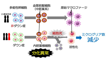 そこで今回、幹細胞から「原始マクロファージ」を分化誘導する方法*3を用いてTs1CjeマウスのES細胞やダウン症の方から作製したiPS細胞から、脳マクロファージの前段階である「原始マクロファージ」へ分化させる実験を行いました。