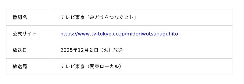 また、「ネイチャーマスター(R)」は、テレビ東京「みどりをつなぐヒト」(2025年12月2日放映)にてご紹介いただきました。アーカイブを一定期間ご視聴いただけます。