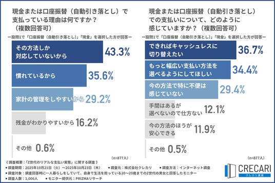 「現金または口座振替(自動引き落とし)で支払っている理由」について尋ねたところ、『その方法しか対応していないから(43.3%)』が最多で、『慣れているから(35.6%)』『家計の管理をしやすいから(29.2%)』となりました。