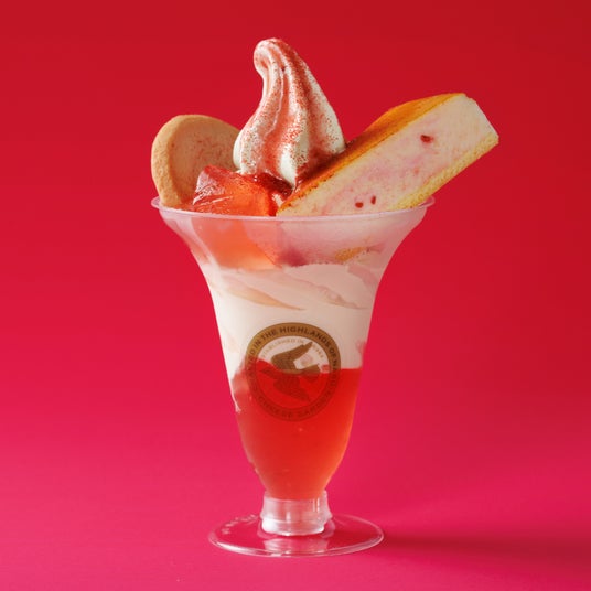 甘い香りと味わいの栃木県産「とちあいか」を使用した苺ゼリーに、ベイクドチーズケーキ風味のチーズケーキソフトを重ねました。上には『御用邸ストロベリーチーズケーキ』と『御用邸ストロベリーチーズクッキー』をのせ、苺ゼリーをトッピングして、フリーズドライのストロベリーパウダーをまとわせた、苺の甘美な味わいとチーズケーキソフトのコクがマッチした、赤やピンクに彩られた華やかなパフェです。