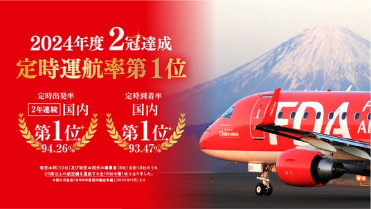 株式会社フジドリームエアラインズ(略称:FDA、本社:静岡県静岡市、代表取締役社長:本田 俊介)は、2025年11月に国土交通省が発表した『航空輸送サービスに係る情報公開』において、特定本邦航空運送事業者(10社)及び特定本邦航空運送事業者以外の事業者(8社)の合計18社のうち、20席以上の航空機を運航する全16社の中で、2024年度における定時運航率が出発94.26%、到着93.47%と、出発・到着便ともに第1位となり2冠を達成しました。なお、2023年度は出発便における定時運航率第1位を獲得しています。