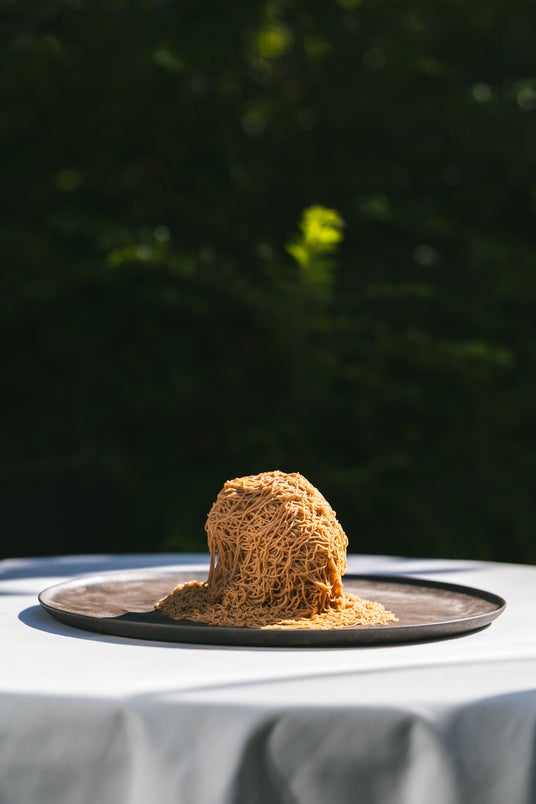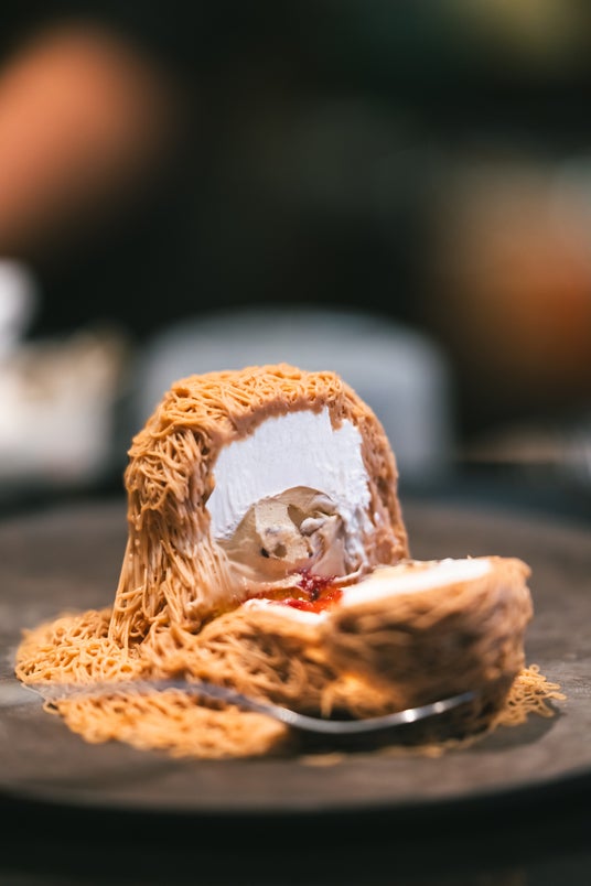 アーモンドが香る軽やかな土台に、栗の風味を引き立てるバニラアイスを重ね、仕上げに超極細に仕立てた栗ペーストを丁寧に絞り出します。空気を含んだ繊細な糸のような構造が、ひと口目からふわりと広がる風味と、ほどける口どけを生み出します。