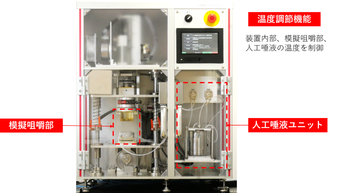 オーラルマップス®は、口の中で食品の状態が変化する主な要因である①歯・舌による圧縮、②体温、③唾液、の全てを制御可能な咀嚼プロセスシミュレータです。食品が口に入ってから飲み込まれるまでの一連の食感の特徴を分析、評価することができます。食品の性質に応じた専用部品を模擬咀嚼部に取り付けることで、チーズやホイップクリームなどの乳製品、チョコレートやグミなどの菓子類の他、畜肉製品やお惣菜などさまざまな食品の評価にも対応しています。