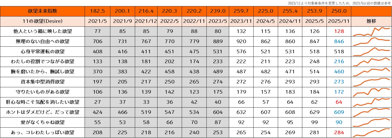〈2025年11月調査における「欲望未来指数」と「11の欲望」の推移〉()内は前回比増減