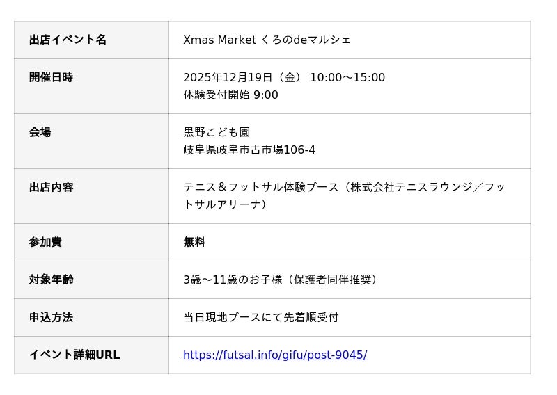 全国でテニススクールを展開する株式会社テニスラウンジ(本社:愛知県名古屋市)は、グループ会社である「フットサルアリーナ」と共に、2025年12月19日(金)に岐阜市・黒野こども園で開催される地域イベント「Xmas Market くろのdeマルシェ」へ出店いたします。