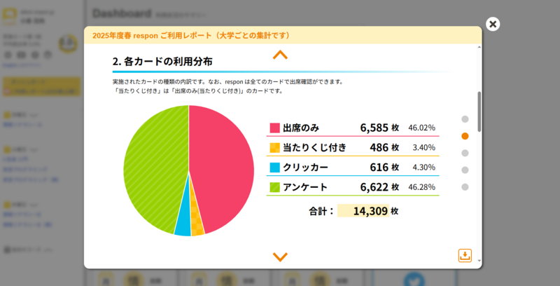 他のユーザの利用状況がわかれば、自身の活用状況と比較でき、今後の利用の参考になります。 そこで、2025年10月に respon の教員用管理ページ内に、2024年度(通年)の利用レポートを公開しました。 レポートは学校ごとの集計にもとづき、教員の利用回数・活用状況を可視化。 そして、2025年12月3日に、同じく 教員用管理ページ内で 2025年度春学期(前期)のレポートを公開しました。
