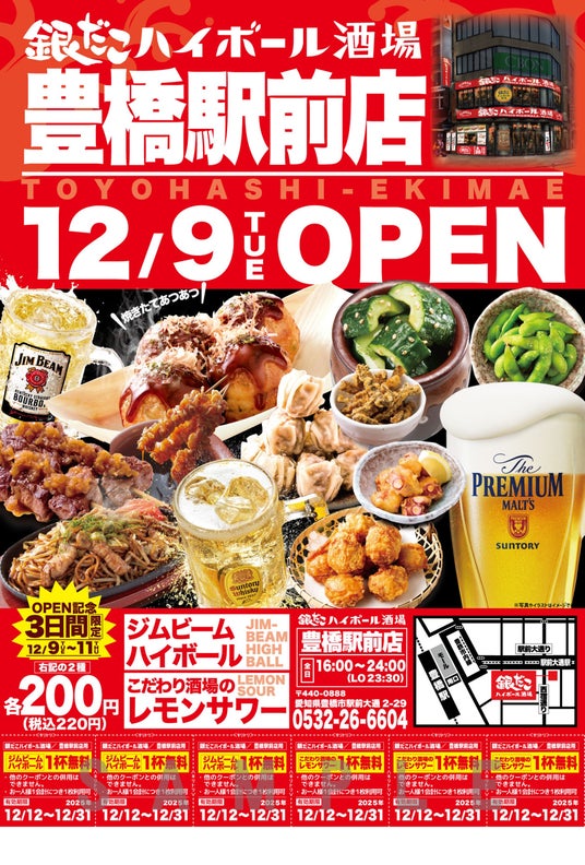 また、オープンを記念して2025年12月9日(火)~ 11日(木)の3日間、 『銀だこハイボール酒場 豊橋駅前店』限定 で、グランドオープンキャンペーンを実施いたします!