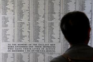 米国立公園局のブライアン・マウルさん(33)にガイドされ、撃沈された戦艦アリゾナの上に建てられたアリゾナ記念館や陸側にあるビジターセンターで、攻撃の経緯や被害の大きさを学び、戦死者に思いをはせた。