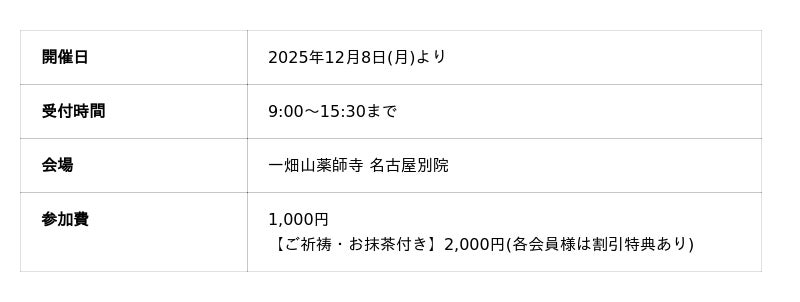 一畑山薬師寺は、12月8日(月)より名古屋別院にて、どなたでもご参加いただける「お守りづくり体験」を正式に開始しました。袋の柄、紐の色、願い事を書く紙のデザインを自由に選び、自分だけの願いを込めた“世界に一つだけのお守り”を作る体験型イベントです。参加費は1000円~。