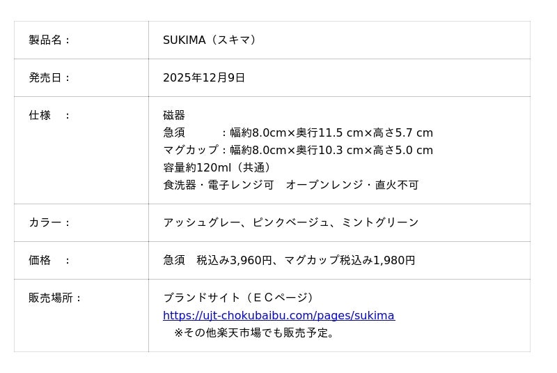 緑茶発祥の地“京都宇治田原”で創業約100年、お茶を中心とした通販事業を展開する株式会社 宇治田原製茶場(本社 京都府宇治田原町、社長 安井 徳重)は、「スキマ時間」をテーマにした国内最小※、一人用の飲みきりサイズのコンパクト急須「SUKIMA(スキマ)」を2025年12月9日から発売します。