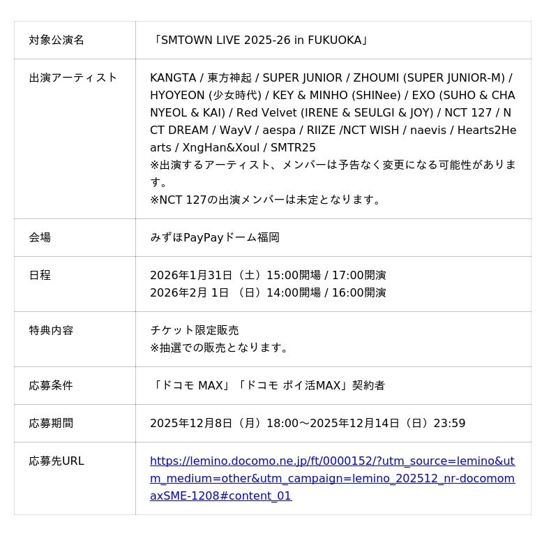 これらの取り組みは、ドコモが「ドコモ MAX」「ドコモ ポイ活MAX」のお客さま向けに提供する「特別な体験価値」特典の1つです。今回のライブチケットの限定販売やプレゼントといった取り組みに加え、SM ENTERTAINMENT JAPAN所属アーティストのグッズプレゼント、映像コンテンツの配信など、今後の取り組みは順次発表予定です。