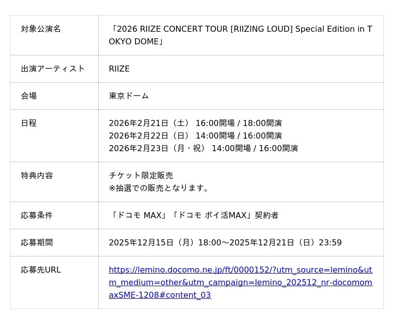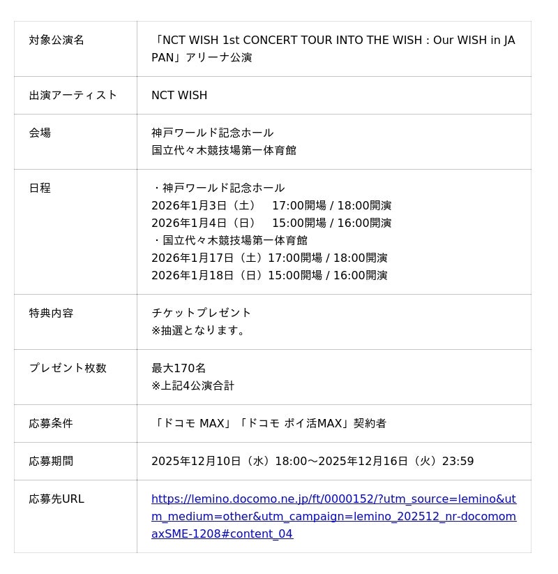 株式会社NTTドコモ(以下、ドコモ)は、2025年12月8日(月)から「ドコモ MAX」「ドコモ ポイ活MAX」をご契約のお客さま※1※2※3を対象に、「SMTOWN」「RIIZE」といった豪華アーティストのライブイベントチケットの限定販売や、「NCT WISH」のライブチケットの抽選プレゼントを実施します。