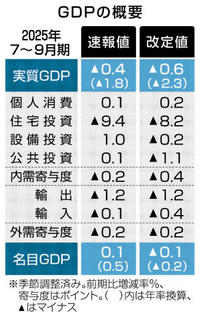 GDP下方修正 年2.3%減 7~9月期改定値 設備投資低調 2025年12月9日 05:00 内閣府が8日公表した2025年7... 残り738文字(全文:755文字) この記事をお読みいただくには「デジタルプラン」または「宅配+デジタルプラン」の会員登録が必要です。無料会員の方はログインしてマイページからコース変更してください。デジタルプランまたは宅配+デジタルプランをご登録中の方はログインしてください。 岐阜新聞デジタル会員に登録すると 無料会員向け記事が読める ニュースレターで最新情報が受け取れる デジタルプラン、宅配+デジタルプランなら Webオリジナルコンテンツが読める 紙面ビューアが読める チケットの先行発売に参加できる お得なクーポンが使える 新規登録ページ ログインページ トップ 岐阜のニュース GDP下方修正 年2.3%減 7~9月期改定値 設備投資低調 関連記事 米粉マフィンとシフォンケーキ&地元野菜サラダ、ゆったりできるカフェ 岐阜・垂井町 パスやシュートの精度高めるには?大垣工高サッカー部が研究 実験用に的を溶接、サンプル採取 ブロッコリー色濃く質高く 岐阜・大垣市で収穫本格化 五輪フィギュアスケート 日本、団体で出場権 サッカー 広島競り勝つ ACLE1次L サッカー 日本、イングランドと対戦 来年4月、W杯へ強化試合 おすすめ記事 【名将流儀】空想で野球は勝てん! 相手を見抜くピッチャーの育て方 太田郁夫さん【ぎふ高校野球】 客引き案内先「損しかない悪質店舗」謎の手数料/メニュー半分品切れ 岐阜市玉宮 客引きの学生、岐阜市玉宮で後絶たず対策強化 若者「みんなの幸せのため」悪びれず 米粉マフィンとシフォンケーキ&地元野菜サラダ、ゆったりできるカフェ 岐阜・垂井町