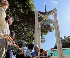 晴れた空の下、被爆者や現地の関係者が次々に鐘を鳴らした。夫がハワイ出身のニコル・シイバさん(43)=ニューヨーク州=は「日米のより親密な関係を望む。私たちは決して長崎の歴史を忘れてはならない」と力強く語った。