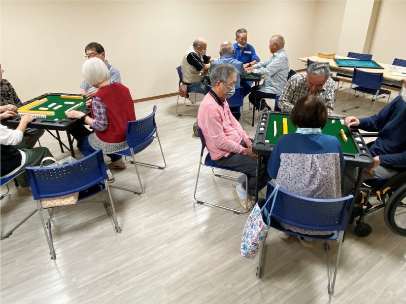 本年度から毎週火曜日、健康麻雀(まーじゃん)の時間を設けています。利用者だけでなく、地域住民も参加できるようにし、もともと麻雀が好きだった方、麻雀は未経験だったけれども友達に誘われて毎週来るようになった方など毎回15人ほどが参加しています。