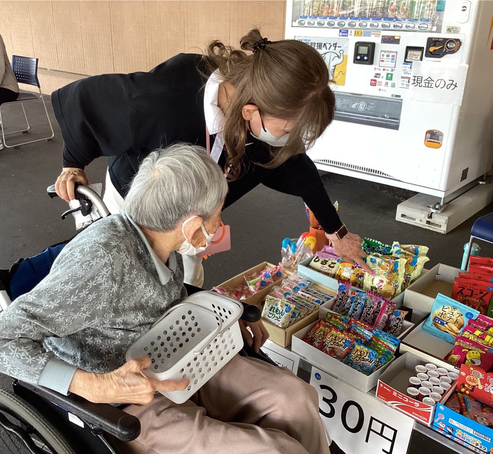 さらに昨年度からは年3回、神戸町の委託を受けた地元NPOと連携して「駄菓子屋さん」を開いています。うち2回はりんどうの玄関先で開催し、誰でも買いに来ることができます。施設で生活する利用者が介護職員に車いすを押してもらいながら買いに来ることも多く、地域の子どもたちと自然に交流できる機会となっています。