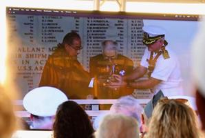撃沈された戦艦アリゾナの上に建てられたアリゾナ記念館で実施。主催者によると、陸側の中継会場を含め約200人がウイスキーを海へ献じる様子を見守った。水筒は黒く焼け焦げ、握り締めた指の痕が残っている。