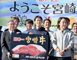 男子テニスの錦織圭選手(35)らは9日、日本テニス協会が強化合宿を行っている宮崎市内で、県や市から激励として宮崎牛など特産品の贈呈を受けた。錦織選手は、合宿で重点的に練習するテーマを問われ「一番は宮崎牛を食べること」とユーモアを交え意気込みを語った。