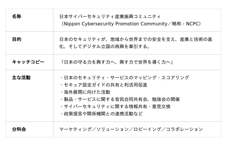 日本サイバーセキュリティ産業振興コミュニティ(NCPC)設立のお知らせ(外部リンク)