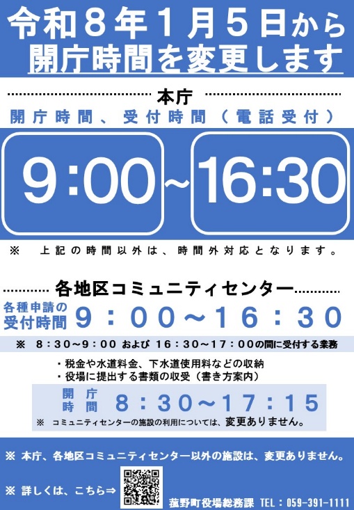三重県菰野町は令和8年1月5日(月)より役場及び各地区コミュニティセンターの受付時間を変更します。