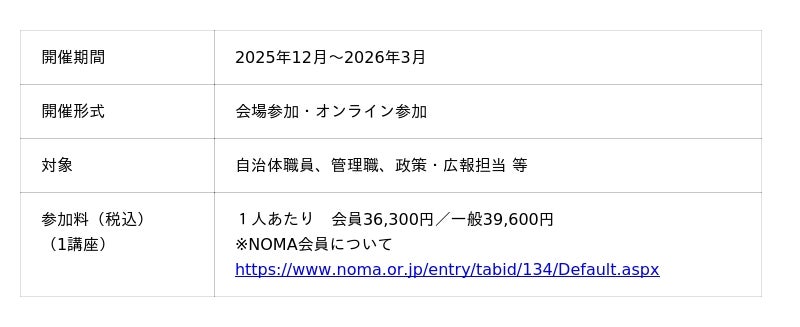 一般社団法人日本経営協会(東京都渋谷区、会長:高原 豪久)は、2025年12月~2026年3月にかけて、自治体職員向けの新規実務講座を全9テーマで開催いたします。