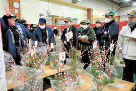 「花もち」競り威勢よく 高山市卸売市場で枝ぶり吟味 20センチ~2.5メートル、480株出品