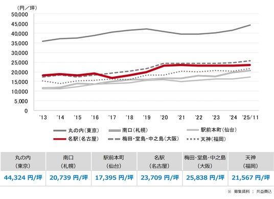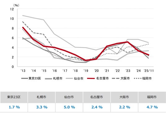 三幸エステート株式会社(本社:東京都中央区、取締役社長:福島正二郎)は、2025年11月度の名古屋市オフィス賃貸状況(空室率&現空面積:全規模、募集賃料&募集面積:全規模、規模別空室率、主要エリア※1空室率:全規模)および全国6大都市(東京・札幌・仙台・名古屋・大阪・福岡)の大規模ビルのマーケットデータをまとめた「オフィスマーケット2025年12月号名古屋」を公表します。