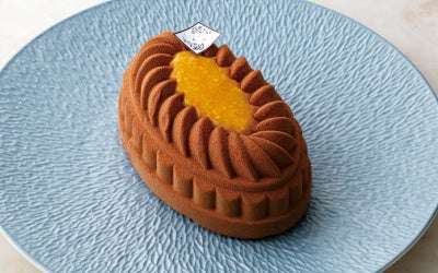 ペルー産ミルクチョコムースと、マダガスカル産カカオマスのダークチョコムースを重ね、南濃みかんの自家製コンフィチュールとアーモンド入りカカオ生地を合わせました。