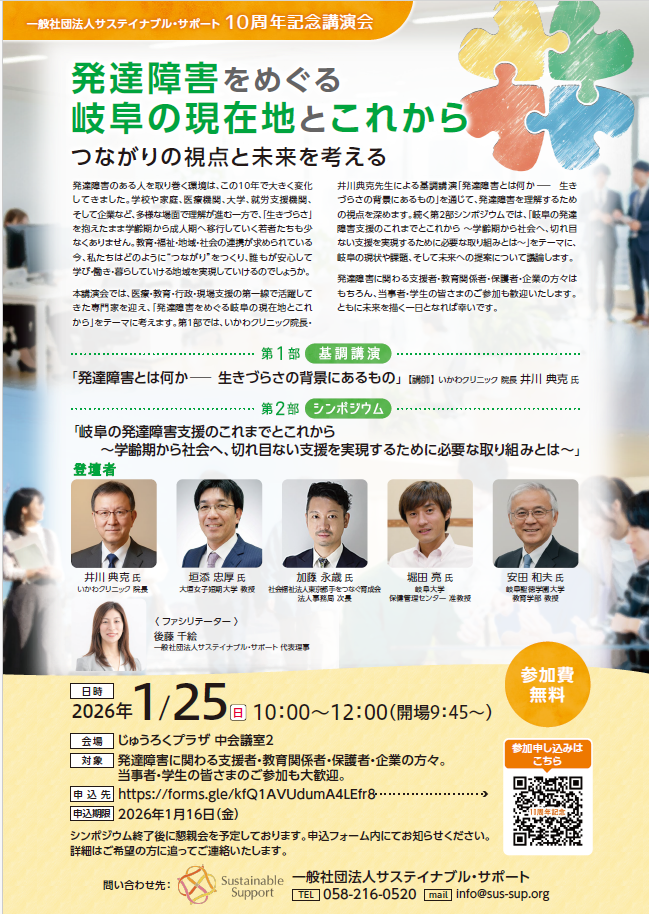 【発達障害をめぐる岐阜の現在地とこれから ~つながりの視点と未来を考える~】をテーマに、専門家による講演とシンポジウムを開催します。