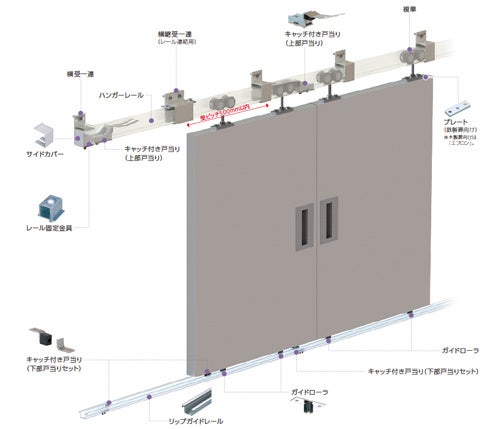 扉を吊るす「吊り車(複車・単車)」、吊り車の軌道となる「ハンガーレール」、ハンガーレールを天井や壁に固定する「受(ブラケット)」などで構成します。レールの材質は、スチール・ステンレス・アルミ製があります。