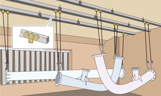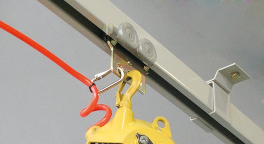 製造工場・物流倉庫などで、工具や半製品を吊り下げ移動するための吊車とレール等で構成した部品です。作業効率化に貢献します。また、防球ネット・ビニールシートの吊り下げ用部品もラインアップしています。