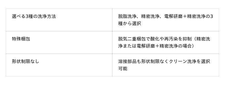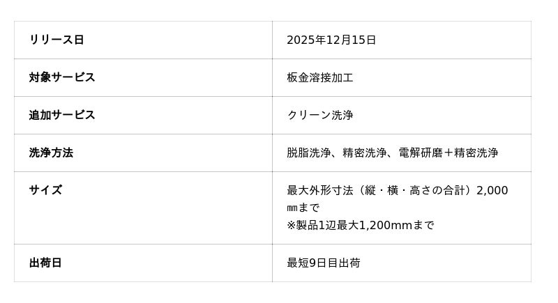 これにより、板金部品で好評だったクリーン洗浄を溶接部品にも拡大し、半導体・光学機器・航空宇宙分野など、より高い清浄度が求められる業界の多様なニーズに応えます。洗浄方法は、脱脂洗浄、精密洗浄、電解研磨+精密洗浄の3種から選択でき、精密洗浄または電解研磨+精密洗浄では脱気二重梱包による高品質な納品を実現します。また、納期については、溶接部品の通常納期にプラス4営業日となる最短9日目出荷を実現し、設計・調達現場の生産性向上と時間価値の最大化を支援します。