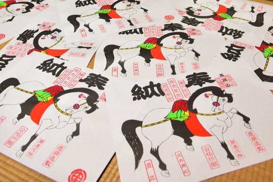 祈願成就を願う縁起物本郷絵馬委員11名が、6色のポスターカラーを使って色を塗り、「疫病退散」「合格祈願」「家内安全」など8種類の祈願事項を押印し、毛筆で注文者の名入れを行います。