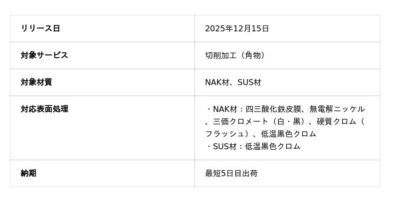 機械部品調達のAIプラットフォーム「meviy(メビー)」(サービス提供元:株式会社ミスミグループ本社)は、2025年12月15日より、切削加工(角物) (以下、切削角物)において、表面処理の対応範囲を拡大しました。