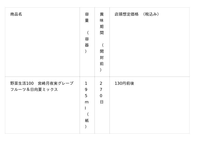 このたび発売する「宮崎月夜実グレープフルーツ&日向夏ミックス」は、宮崎県産の甘味と酸味のバランスがよい月夜実と、ほんのりとした甘味と爽やかな酸味の日向夏の味わいの野菜・果実100%ミックスジュースです。砂糖不使用で、1日分※1のビタミンCを摂ることができます。朝食のおともや、リフレッシュしたいときにおすすめです。