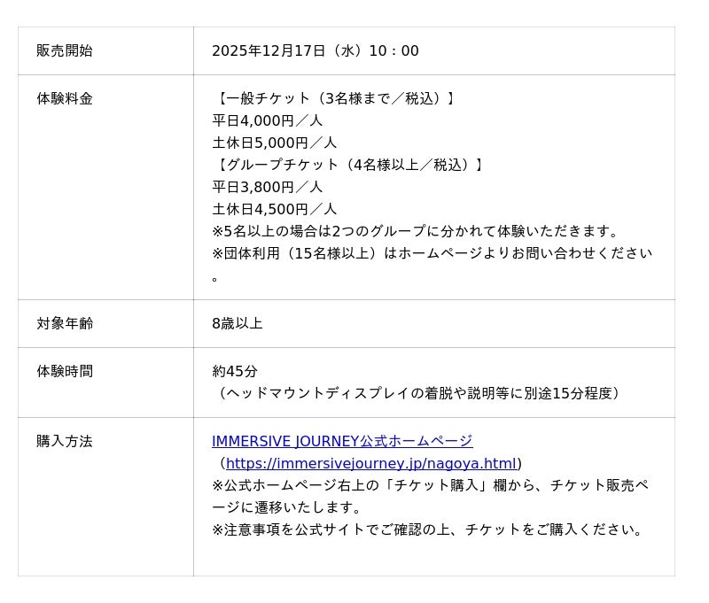 株式会社名鉄インプレス(本社:愛知県名古屋市、代表取締役社長:鷲見勝彦)は、株式会社CinemaLeap(本社:東京都品川区、代表取締役:大橋哲也)と連携し、2026年1月23日(金)に開業する東海エリア初の大型XRエンタテインメント施設「IMMERSIVE JOURNEY(イマーシブジャーニー) 名古屋」のチケット販売を公式サイトにて2025年12月17日(水)より開始します。