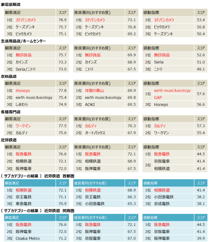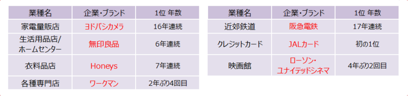 ※各業種のランキング対象企業・ブランドのうち、原則として、顧客満足・推奨意向(おすすめ度)・感動指標の各3位以上の企業・ブランドを表示。その他の指標の結果については、別添資料参照。近郊鉄道、クレジットカードについては、サブカテゴリーも表示。