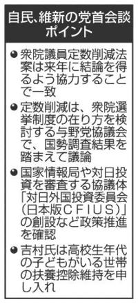 定数削減「来年結論」 自維党首、協力で一致 臨時国会きょう閉幕 2025年12月17日 05:00 高市早苗首相と日本維新の会の吉村... 残り739文字(全文:756文字) この記事をお読みいただくには「デジタルプラン」または「宅配+デジタルプラン」の会員登録が必要です。無料会員の方はログインしてマイページからコース変更してください。デジタルプランまたは宅配+デジタルプランをご登録中の方はログインしてください。 岐阜新聞デジタル会員に登録すると 無料会員向け記事が読める ニュースレターで最新情報が受け取れる デジタルプラン、宅配+デジタルプランなら Webオリジナルコンテンツが読める 紙面ビューアが読める チケットの先行発売に参加できる お得なクーポンが使える 新規登録ページ ログインページ トップ 岐阜のニュース 定数削減「来年結論」 自維党首、協力で一致 臨時国会きょう閉幕 関連記事 訃報 石原良さん 訃報 玉寄哲永さん 世田谷一家殺害 住宅に侵入形跡 「国宝」が2部門選出 アカデミー賞ノミネート候補 非常ボタン 電源切れる 東京のサウナ店火災 宿泊施設が「差別対応」 長野 イスラエルの業者に おすすめ記事 〈詳報〉LRTを考える=まちづくりを考える 岐阜県がフォーラム【みのひだ乗り物探訪 第107回】 「能登カキ」食べて能登を応援 モレラ岐阜に期間限定の出張小屋 高級毛織物「尾州」の魅力伝える 岐阜県庁で企画展スタート 若手デザイナーが出品 ファッションや建築、ヴィジュアル領域の研究成果 岐阜市立女子短大の卒業発表会始まる