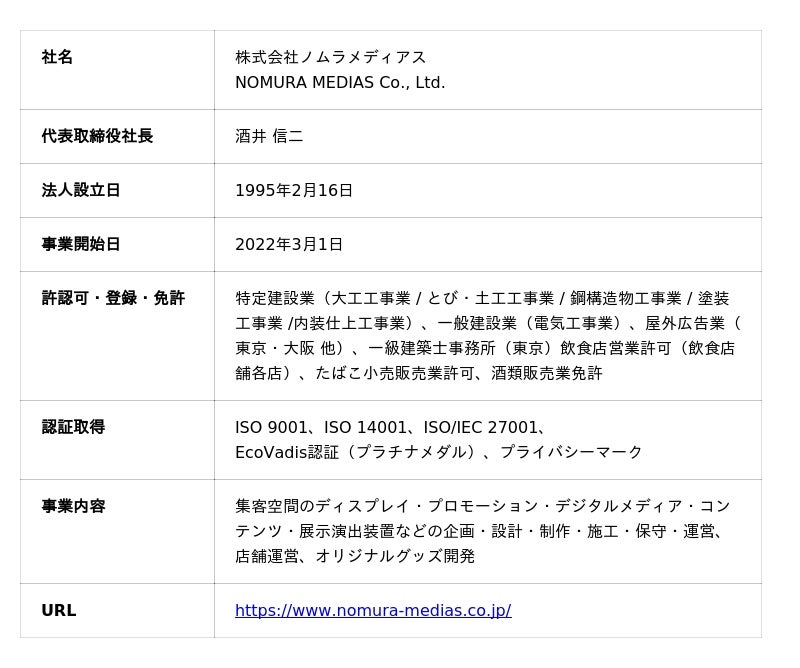 2022年3月、株式会社乃村工藝社の子会社であるノムラテクノ株式会社、株式会社ノムラデュオ、株式会社ノムラデベロップメントの3社が合併し、誕生。「空間プロデュース」「展示演出・メンテナンス」「ショップ&イベントマネジメント」の3つの空間活性化事業を軸に、お客様の想いや困りごとを具体化し、解決する、付加価値の高い“空間”を媒介にした体験を提供するとともに、お客様の事業繁栄とブランディングを最大化するサポートを行っています。
