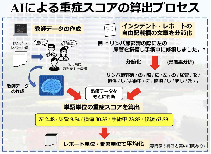 本研究グループは、名大病院の所有する膨大なインシデントレポートのテキストデータを機械学習の技術を用いて分析し、ある医療者集団が、医療行為そのものや、不十分な確認行動などによって患者に生じさせた疾病の「重症度」や「過失性」を数値化することに成功しました。その結果は、同院で患者安全の専門家たちによって分析されてきたデータと比較しても高い相関が示されたことが評価され、2022年12月12日付「Journal of Medical Systems」、2024年10月11日付「BMJ Health Care Informatics」に掲載されました。この手法は名大病院で長期にわたって蓄積されてきたインシデントレポートのデータと、AI技術を融合させて開発されたもの(※3)で、 患者安全という分野において全く新しい物差しとして注目され、医療事故防止など、患者の安全確保への貢献が期待されています。