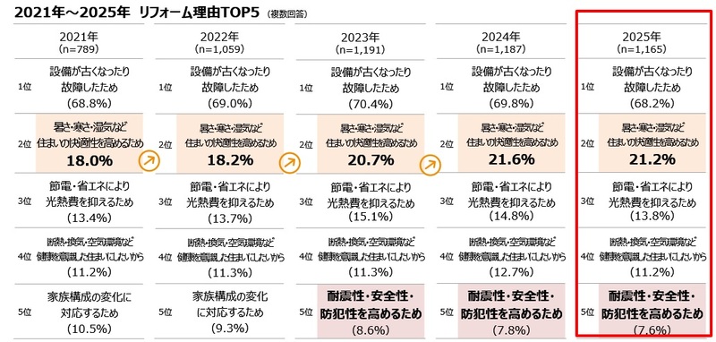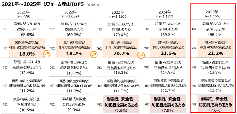 また、5位の推移を見ると、当初の「家族構成の変化に対応するため」から、「耐震性・安全性・防犯性を高めるため」に入れ替わっており、、災害や犯罪から家族を守るためのリフォームが重視されるようになっています。