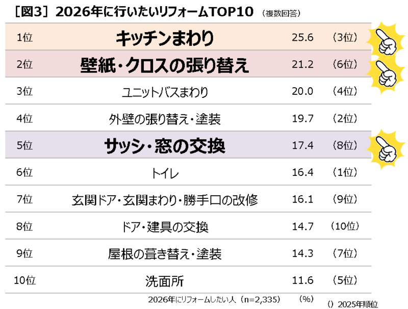 これまで6位が定位置の「壁紙・クロスの張り替え」(21.2%)は2位へ、「サッシ・窓の交換」(17.4%)は2025年8位から5位へと上昇しています[図3]。