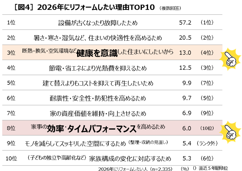 ・上昇中のリフォーム理由から2026年のリフォームトレンドを読み取ると、4位→3位「健康を意識した住まいにしたいから」、10位→8位「家事の効率・タイパを高めるため」。健康とタイパのためのリフォームが注目されそう。
