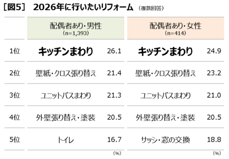 2026年にリフォームしたい場所を配偶者がいる男女で見ると、第1位は男女とも「キッチンまわり」(男性26.1%、女性24.9%)でした[図5]。