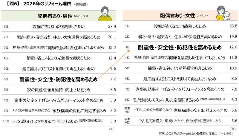 ■リフォーム理由から見る男女の意識差「耐震性・安全性・防犯性を高めるため」にリフォームしたい女性、守る意識が高め