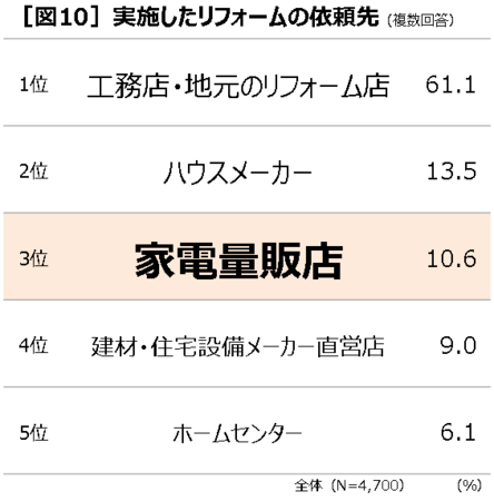 ■リフォームの依頼先、「工務店」「ハウスメーカー」に次いで「家電量販店」がランクイン