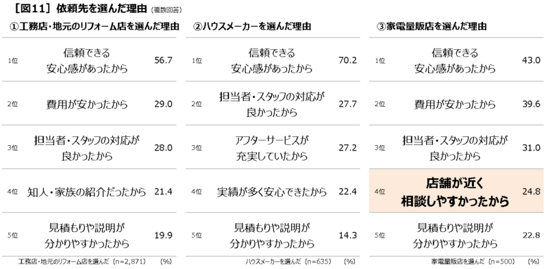 依頼先を選んだ理由を聞くと、いずれも「信頼できる/安心感があったから」が1番の理由となっていますが、工務店・地元のリフォーム店と家電量販店は2番目の理由として「費用が安かったから」が挙げられています。また、家電量販店は「店舗が近く相談しやすかったから」(24.8%)という理由で選んだ人も多くなっています。店舗数が多い家電量販店は、生活圏内の最寄りに店舗があることも人気の理由となっているようです[図11]。
